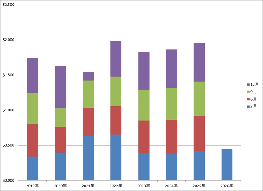 $0.450で前年3月と比較し7.42%の増配。